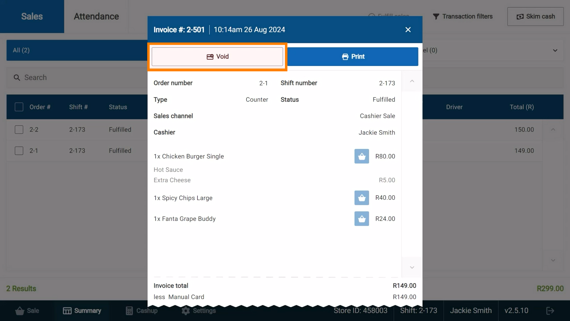 - On the Summary page, select the invoice and on the invoice details screen, tap Void.