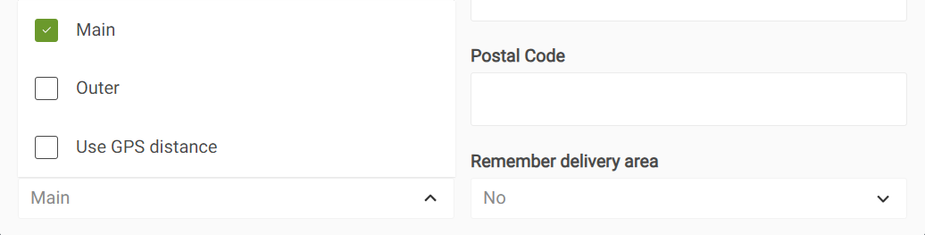 If an address is manually added, or to override the GPS distance, you can select from pre-set delivery areas using the Delivery area drop-down.