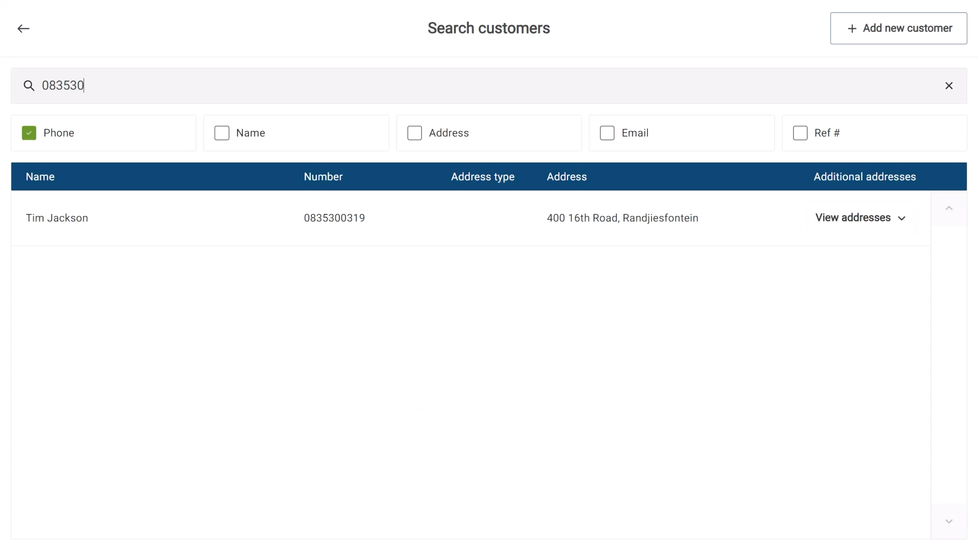 Start by searching for their phone number to check if they are already registered. Note that CounterPOS requires at least the first three characters of a name or number to begin a search.