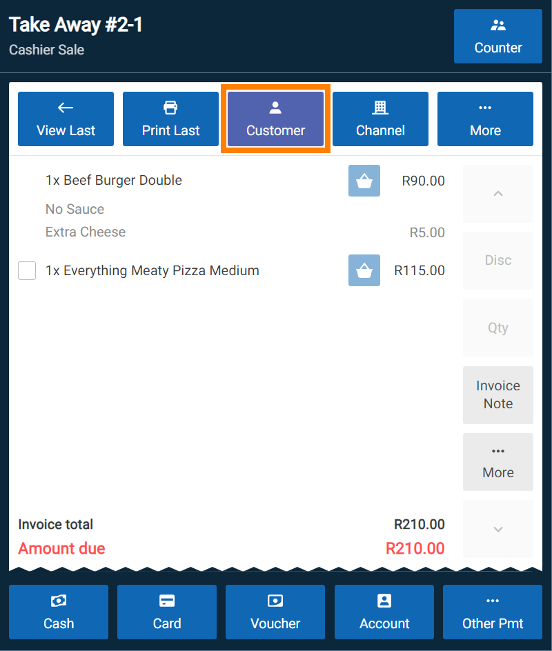 Customers are linked to sales either by selecting a Collect or Delivery sale, or by tapping the Customer button on the sales screen.
