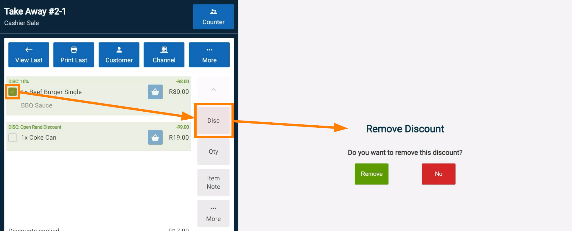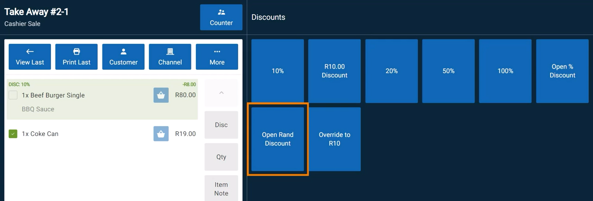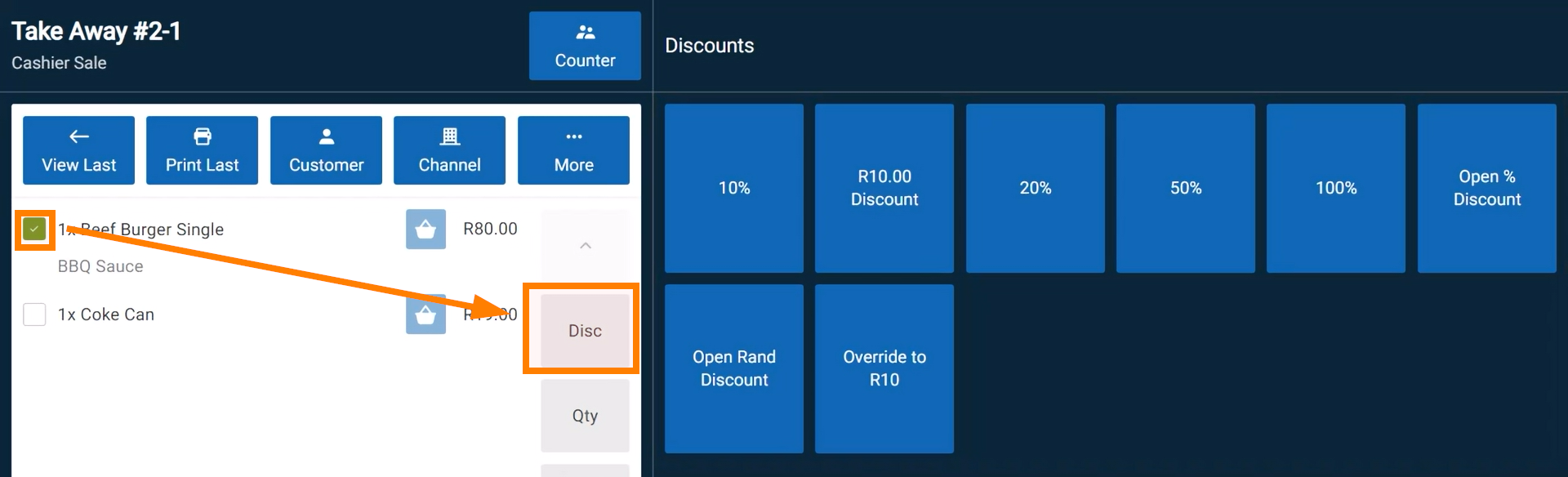 - Tap the Disc button to open the discount menu.