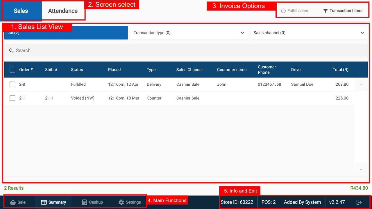 The CounterPOS interface can be divided into Five main sections: