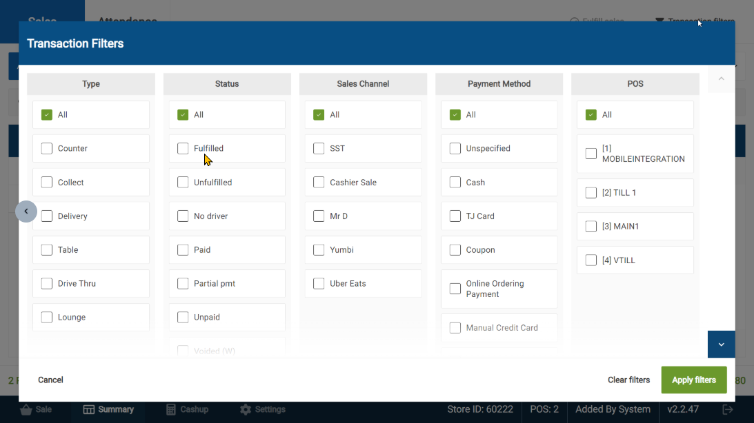 - Invoice options - This allows you to set Transaction Filters, or Fulfil sales that have been paid and delivered.