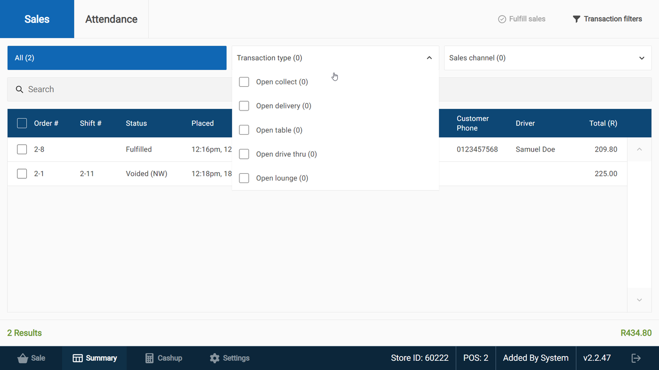 - Transaction/Sales channel filter function - while viewing the summary tab, you may search the current list for specific invoices or order numbers; this is very helpful near the end of a busy day if a customer requests a duplicate copy of their receipt.