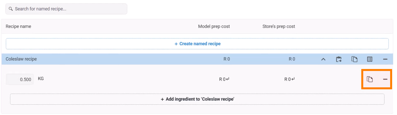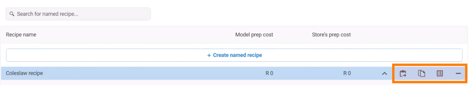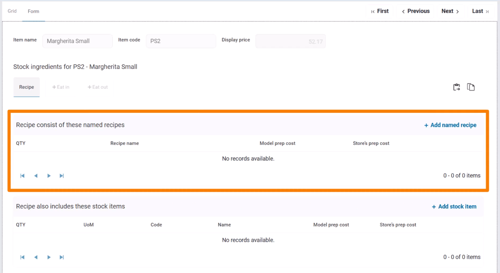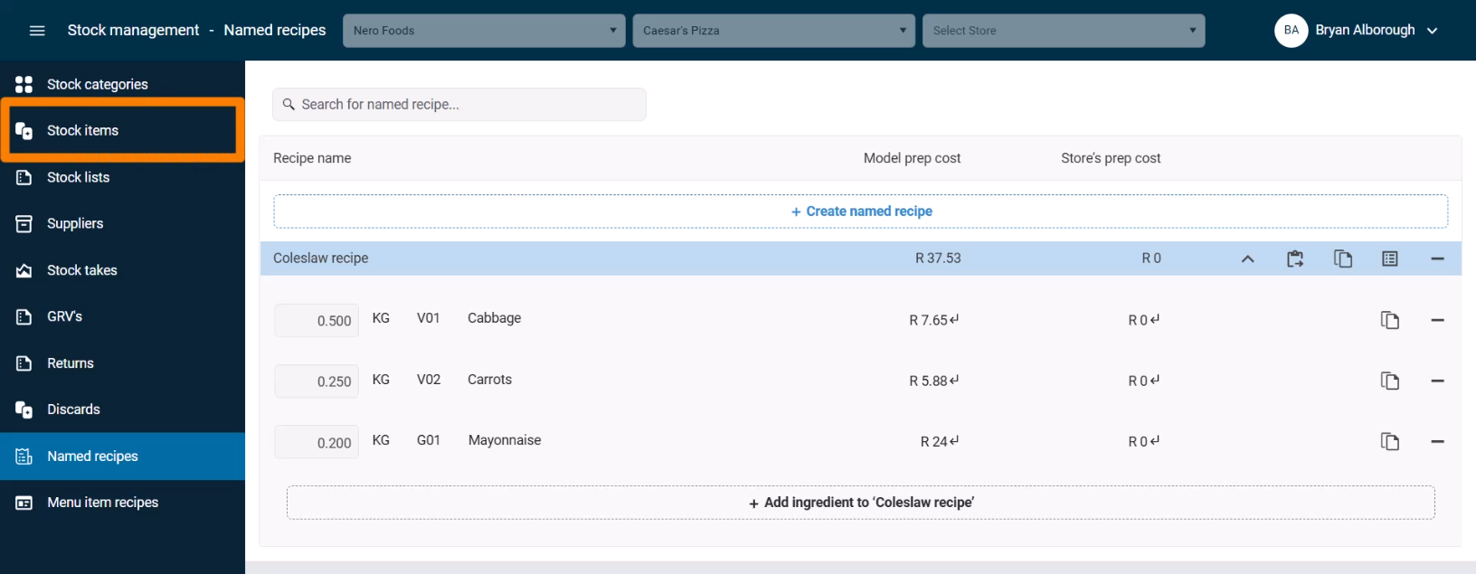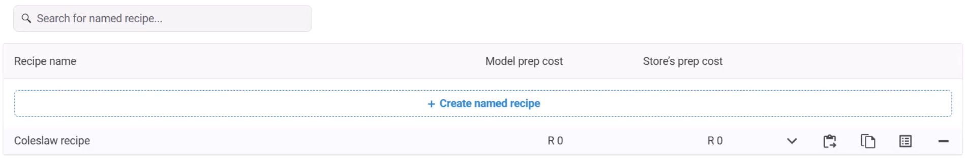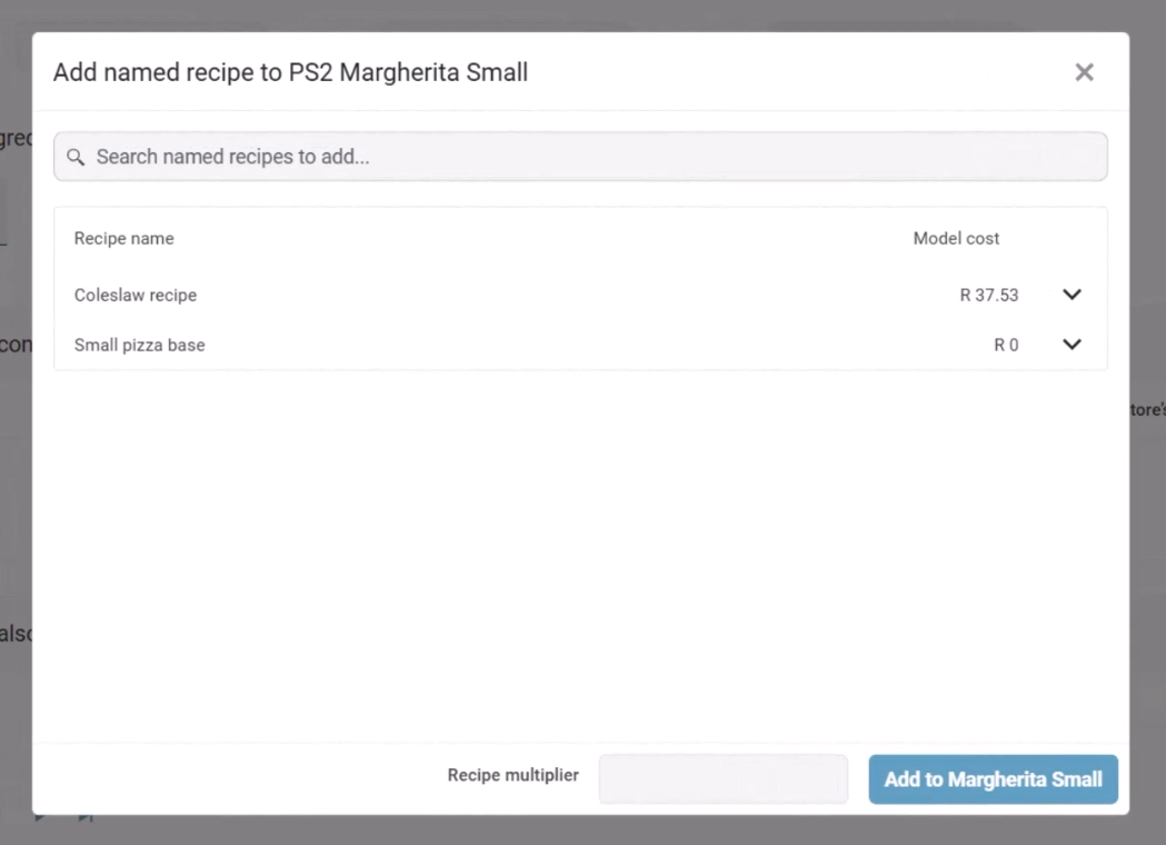 This helps streamline recipe management by creating sub-recipes for frequently used components—such as pizza bases or chip packets that always include chip forks and salt sachets. Named recipes can also be used for stock items that are prepared in-store and need to be tracked, like coleslaw or pre-mixed sauces.