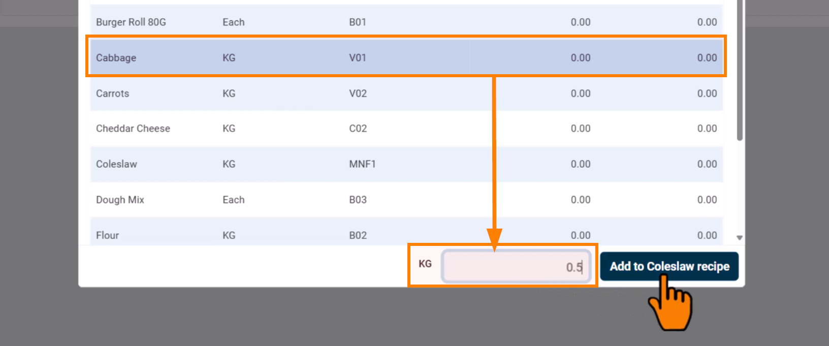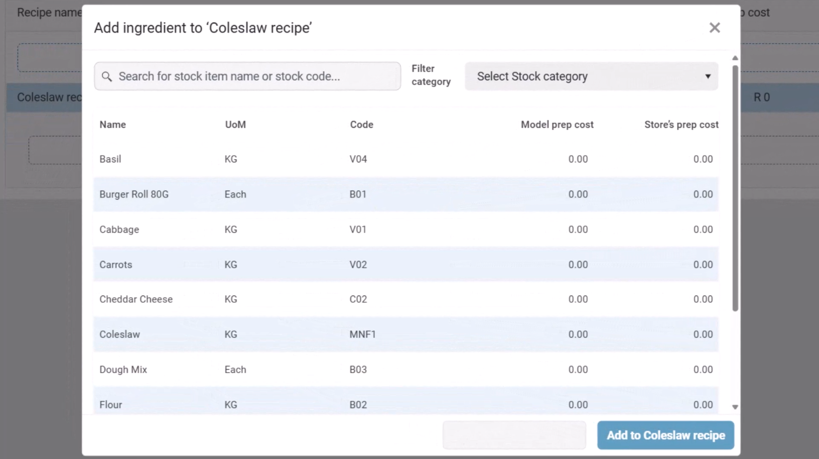 In the pop-up window, search for a stock item (e.g., cabbage, carrots, mayonnaise).