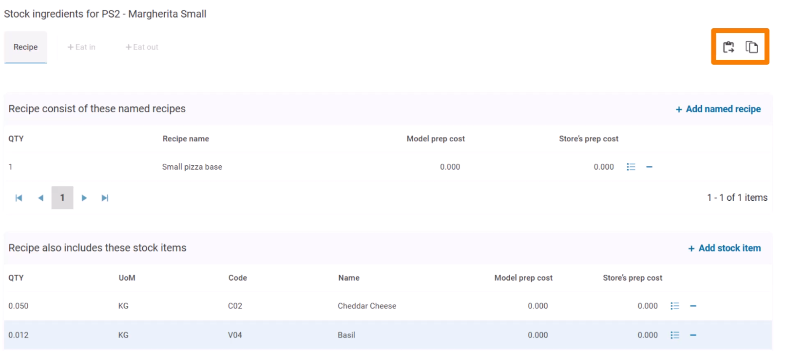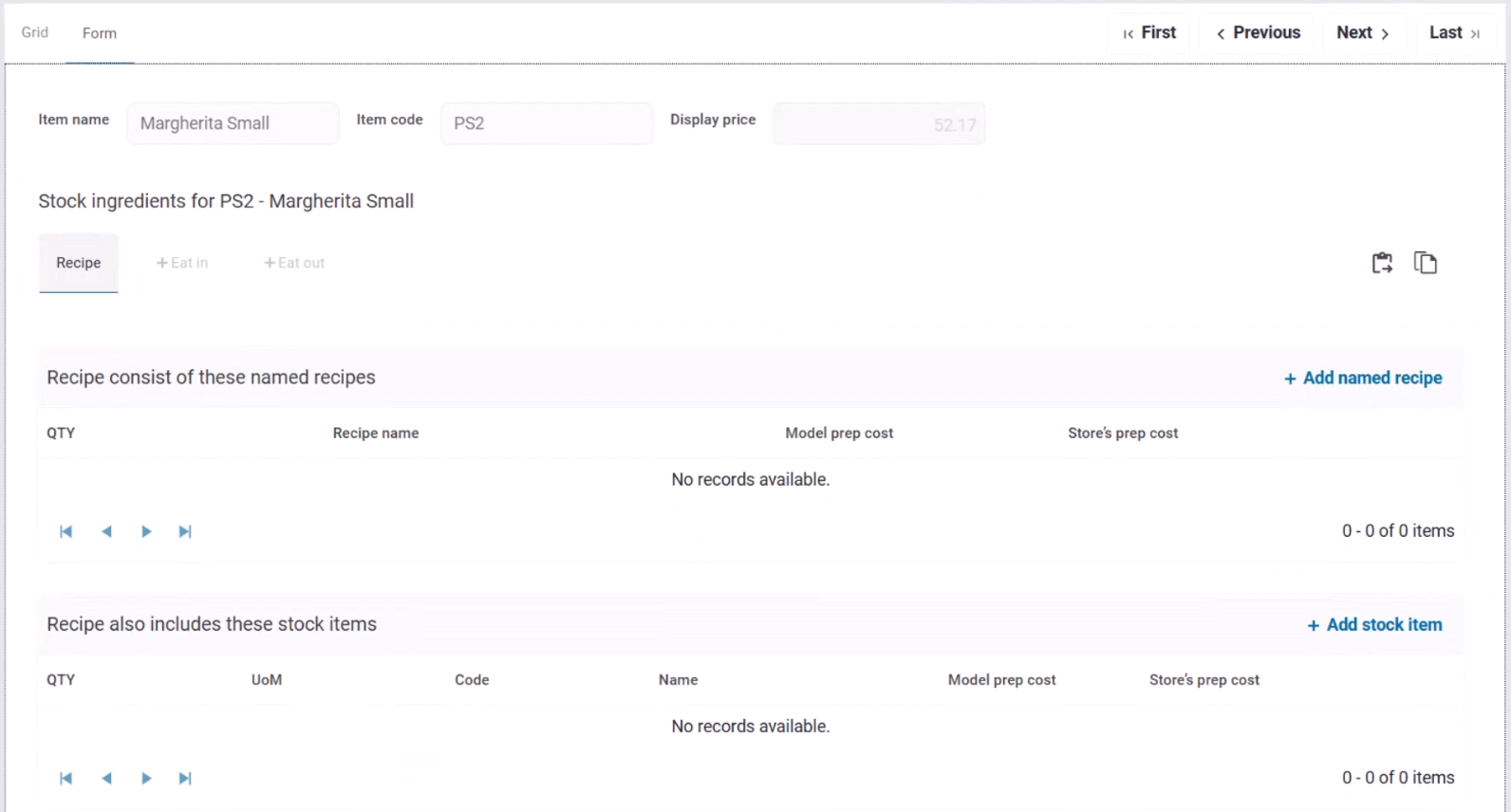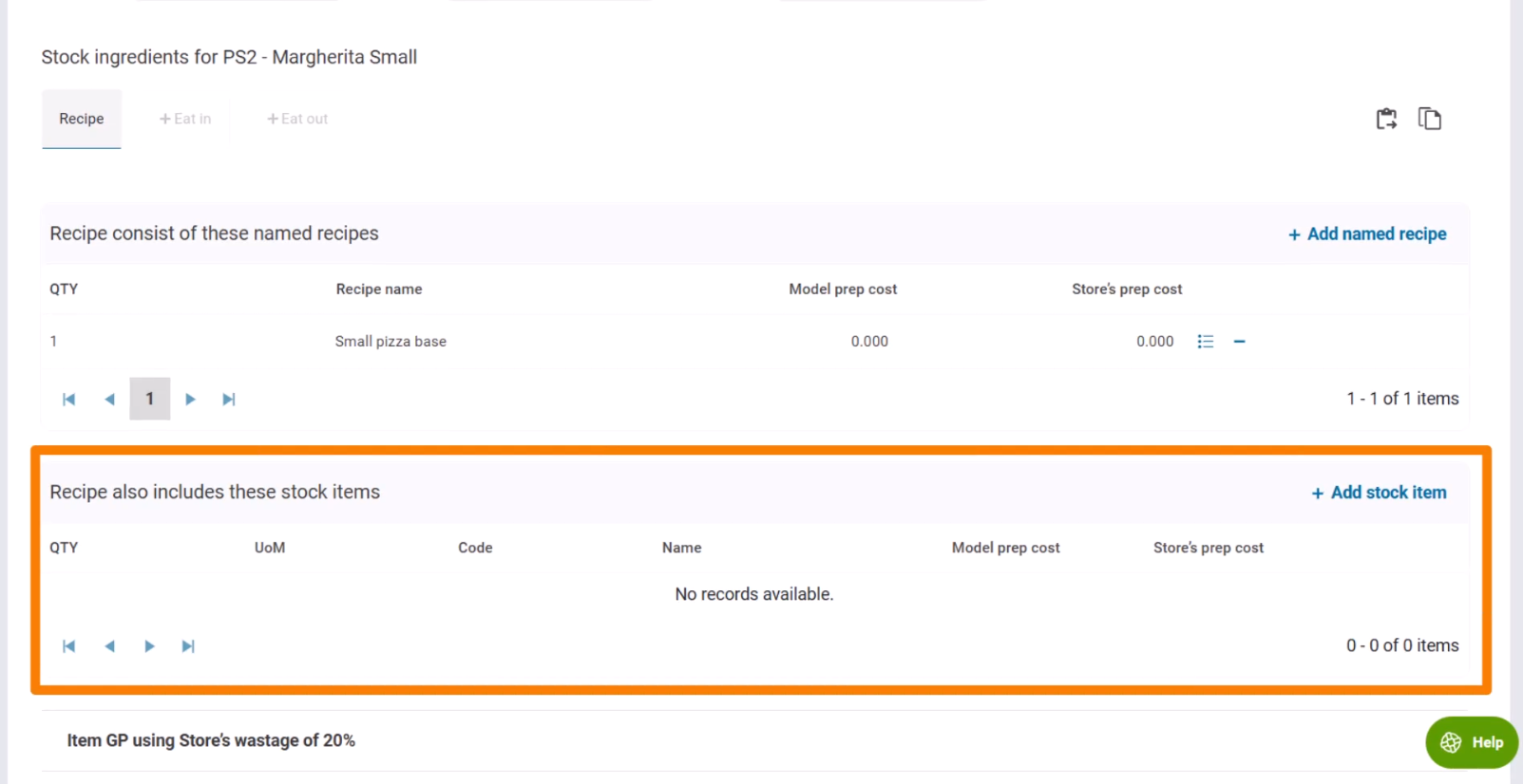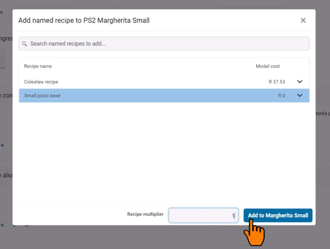Named Recipes are reusable sub-recipe, or recipe components, that can be linked to menu or stock items. If a named recipe already exists (e.g., a Small Pizza Base), you can add it directly: