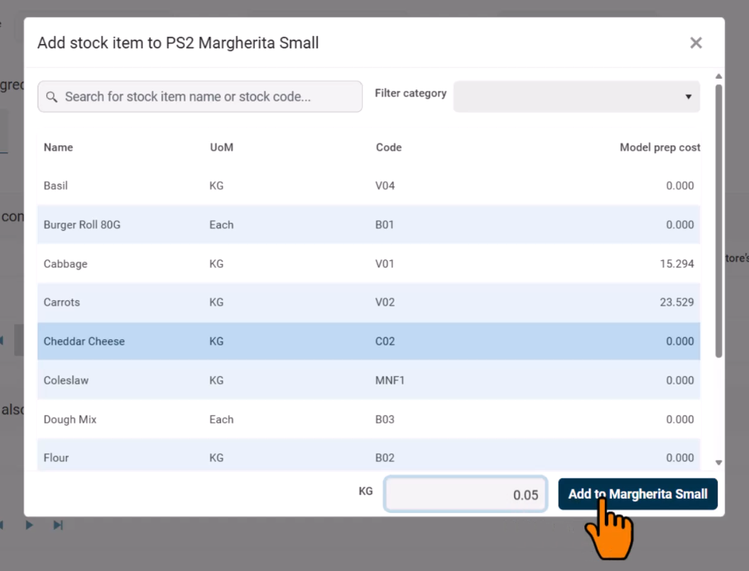Search for the stock item (e.g., mozzarella, tomato sauce).