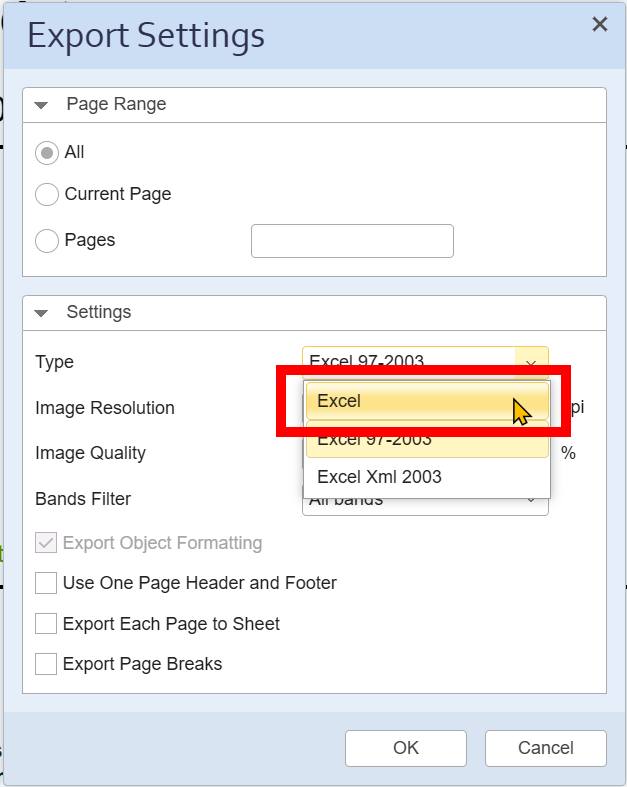 When exporting a report, the default format is Excel 97–2003. Some columns may download as “images” rather than text in this format.
