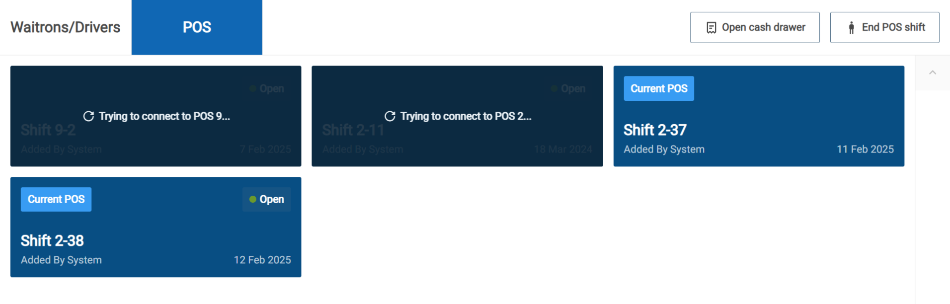 Q: Why does my POS shift say “Trying to connect” and is not available to cash up?
