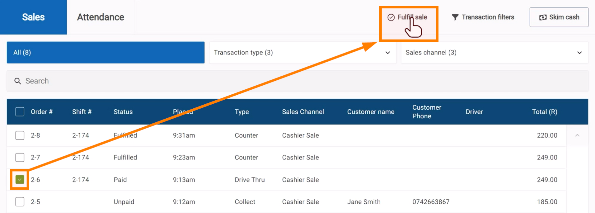 Orders can be marked as fulfilled on the Summary page. Select the orders and click Fulfill sale.