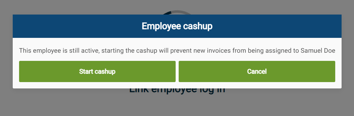 If the employee is still clocked in, an alert will inform you that they can no longer be assigned new sales. Tap Start Cashup to proceed.