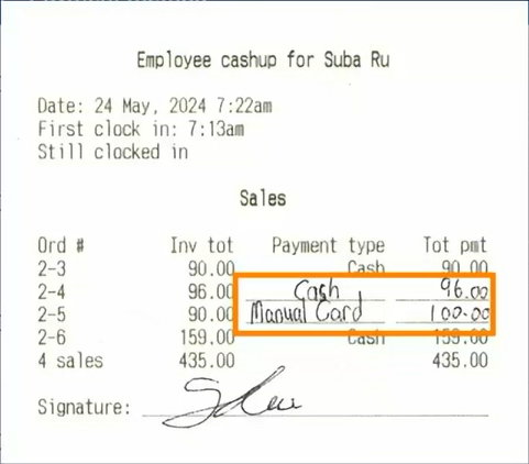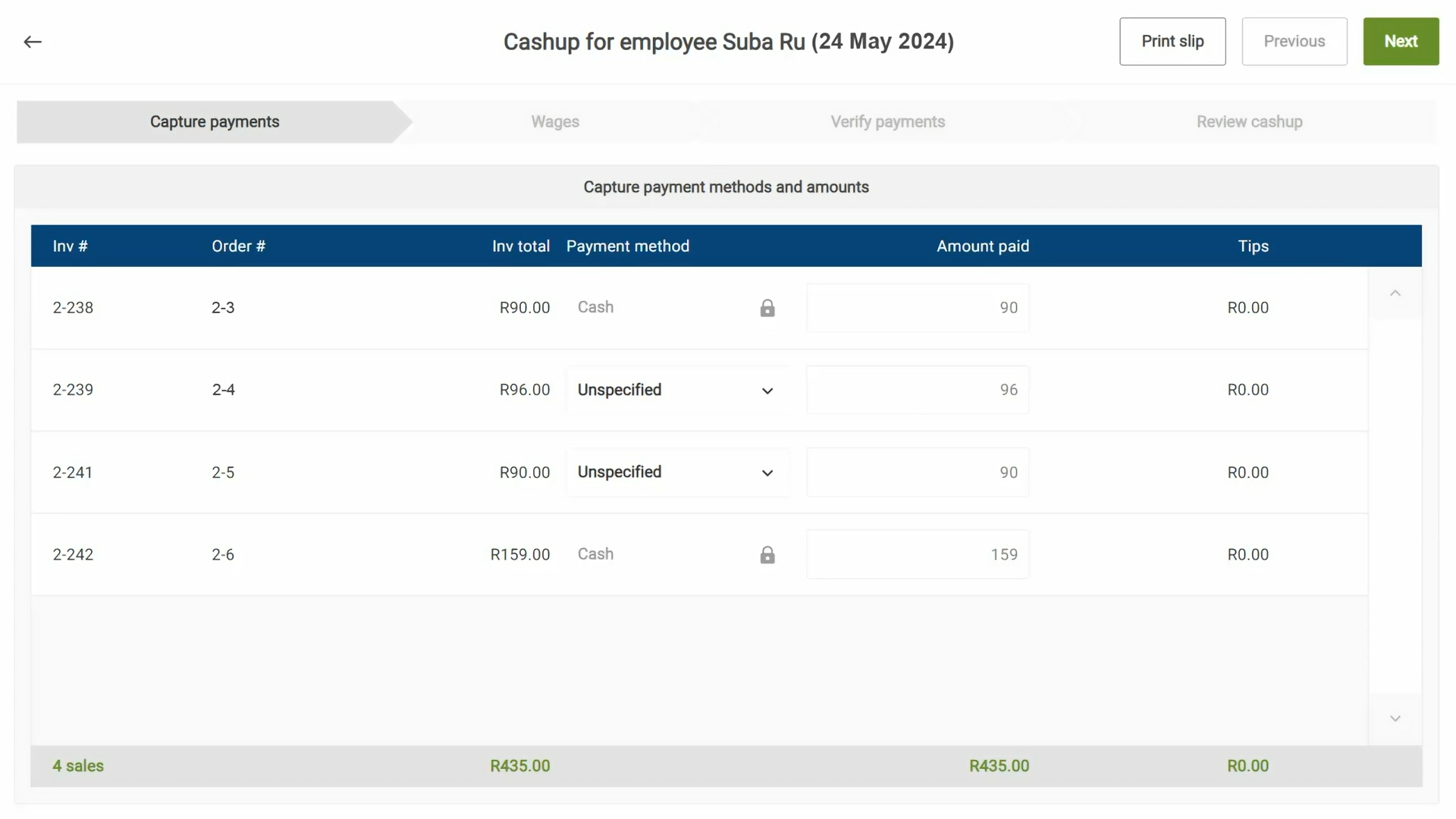 Tap Print Slip to generate a summary of all assigned sales. The employee can note on the slip how each order was paid before entering payments into CounterPOS.
