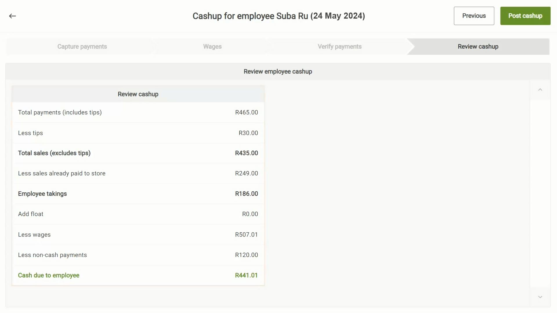 | Note that you can tap any tab at any time to move between sections of the cash-up process. The final step, Review Cashup, will allow you to post the employee’s cash-up. |
