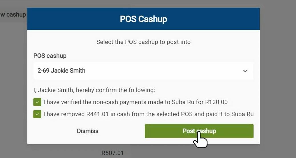 - Cashier Acknowledgement – The cashier must tick the acknowledgment statements to confirm they have reviewed and verified the payments.