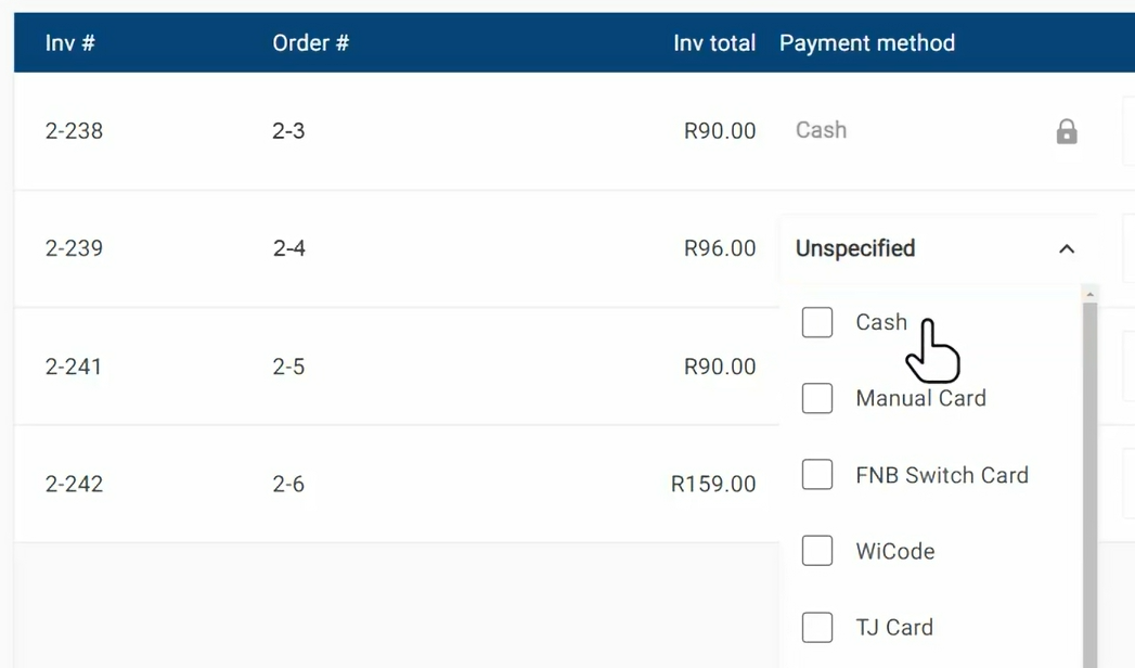 Tap the Payment Method for each unpaid sale and select the appropriate option (e.g., Cash or Manual Card Payment).