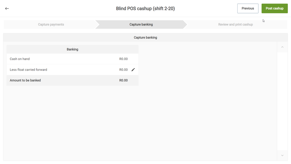 This screen provides a cash banking review; beginning with the Cash on Hand figure captured in step 1 of the cashup process, CounterPOS will subtract the float for the next shift to return the value of cash to be banked.