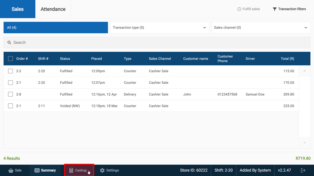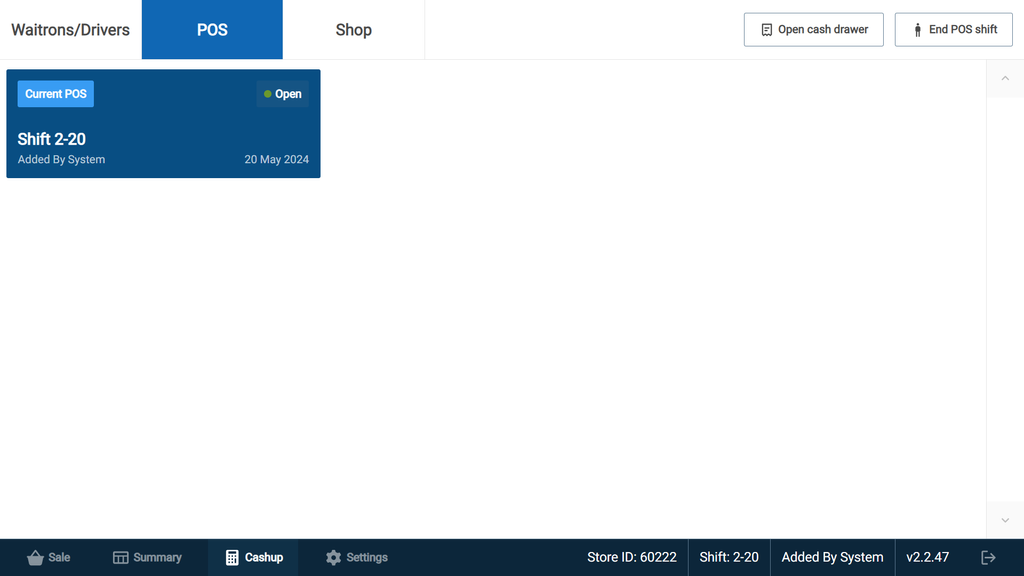 On the Cashup screen, you will be shown the POS cashup screen by default, where you are presented with a list of till shifts across all tills for the selected date.