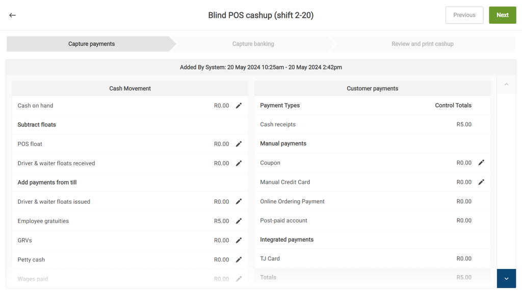 At the end of the cashier shift/trading day, you will need to complete the shift cashup. This process saves all the information entered into the system during the shift and comparing that with the information entered by your employees, this will give an indication of whether the employee has added all transactions and added all the payments to the till.