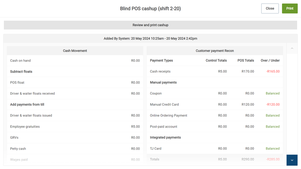 The review page will reveal the sales figures and inform you if you are Over, Under or Balanced on different areas of your cashup. From here the cashup can be Closed or Printed.