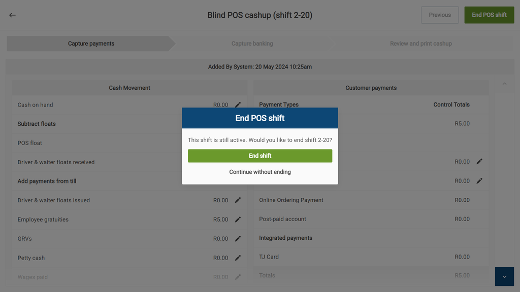 If your shift is still active, you will be prompted to end the shift. Choose “Continue without ending” if you wanted to edit a few things prior to ending the shift. Choose to end the shift to proceed with the cashup.