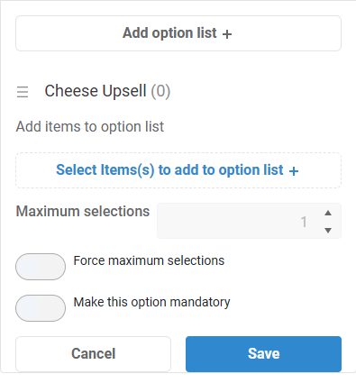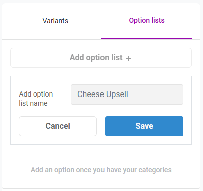 Name the list (e.g., "Drink Options" or "Cheese Upsell"), then click Save.