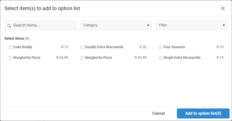 Click Select Item(s) to Add to Option List +. A panel will open allowing you to search through your menu for the items to add to this list.