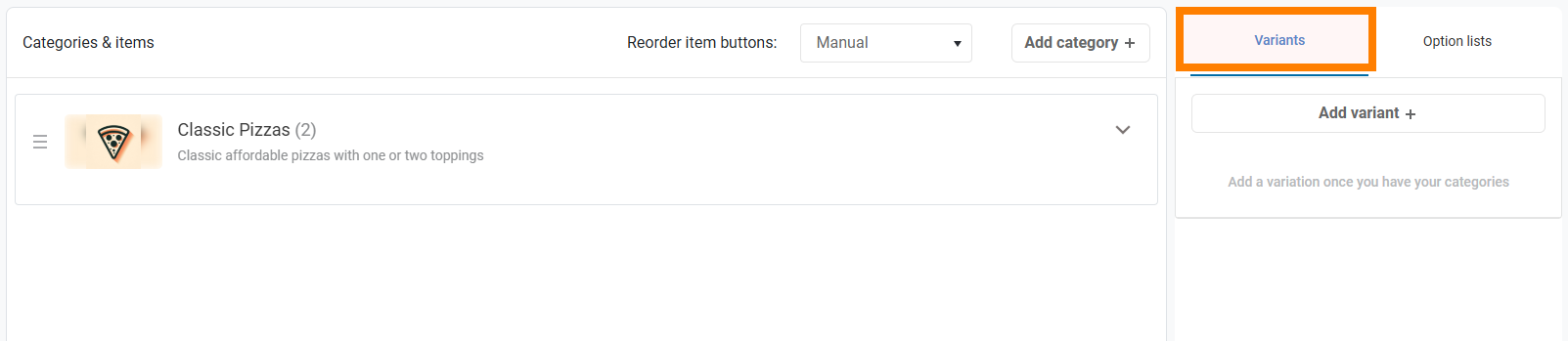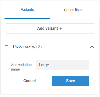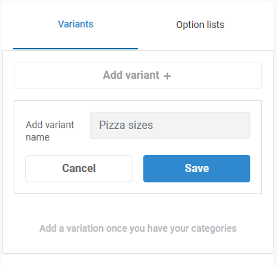 Click Add Variant and name your variant group (e.g., "Pizza Sizes"), then click Save.
