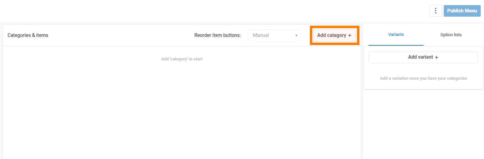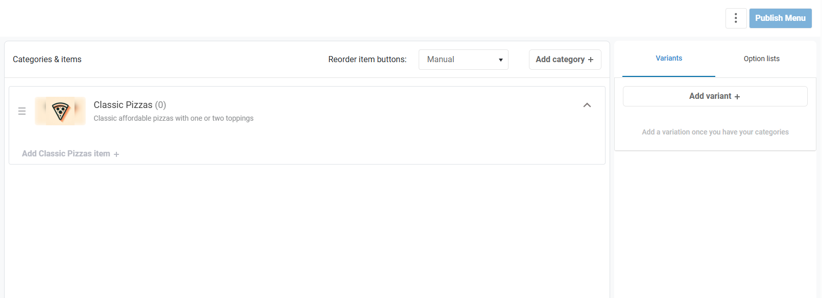 | Note: If you have not yet set up a menu you will see an empty screen here. This is normal since no items, categories, variants, or option lists have been added yet. Follow the steps below to build your menu from scratch. |