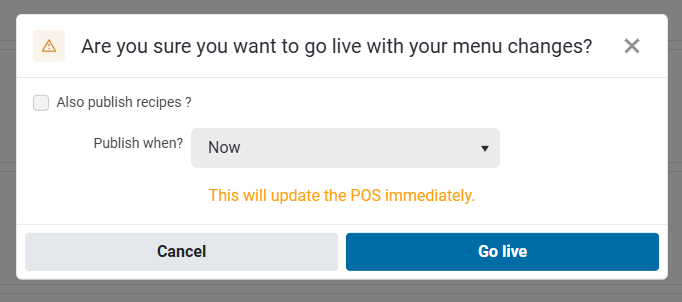 First, you will have the option to Also publish recipe/recipe changes - this will include any updates to recipes you may have done on the Named recipes or Menu item recipe pages.