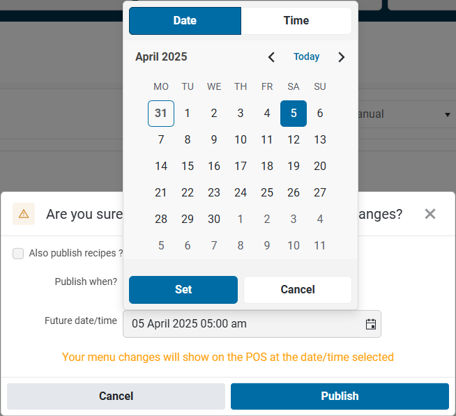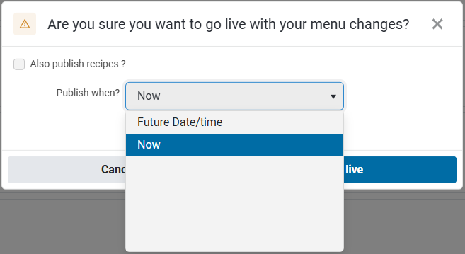 - Selecting Future Date/time lets you specify a publish date for your changes to go live. This is useful if you want to, for example, create a change for a new weekend special earlier in the week. You can make the change, and schedule the new menu to go live on Saturday morning.
