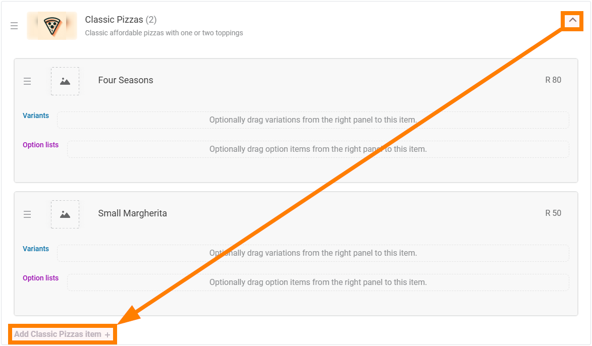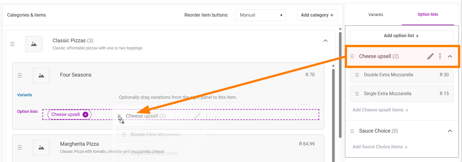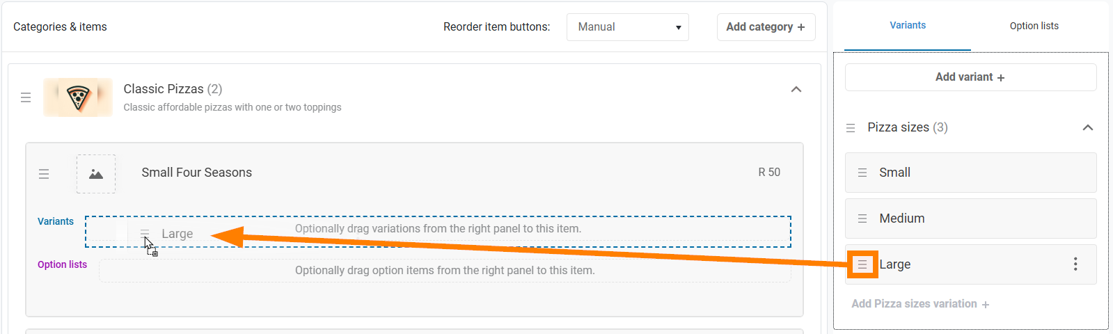 To assign a variant to a menu item, drag the variant by its handle icon and drop it onto the variant field of the item.