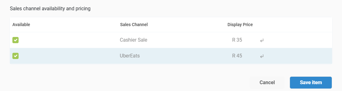 Sales channel availability and pricing allows you to specify different pricing for different sales channels. For example, if you are using UberEats or another third-party delivery system, you can specify that this item will have a different pricing, and you can toggle the availability of this particular item on that channel.