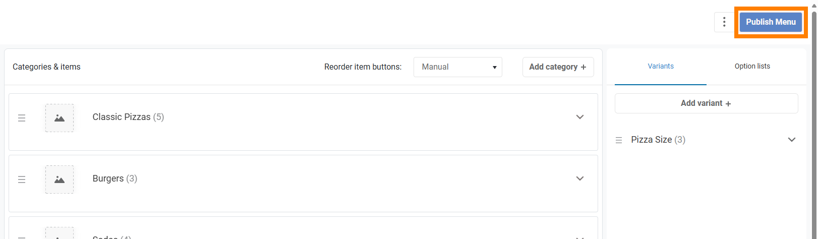 Once you have set up your menu, click Publish Menu. This will apply your changes and make the menu available on your CounterPOS devices.