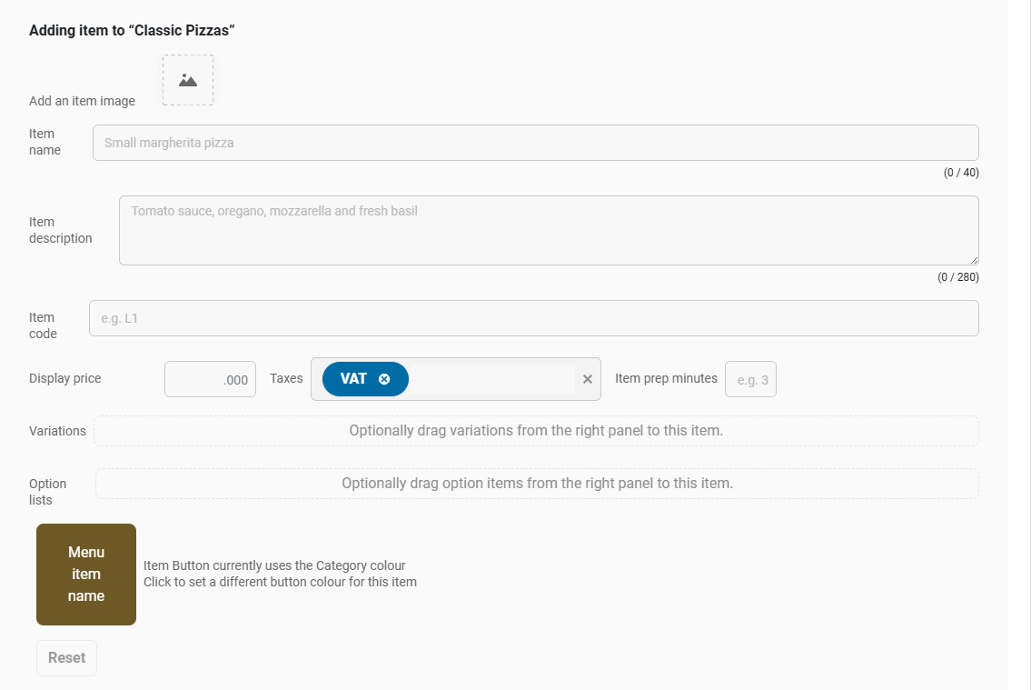 - Variations- Set a variation for this item by dragging an item from the Variants tab (A small pizza would need the "small" variant, for example). Note that only one variant can be set for a menu item. See below for more detail on variants.
