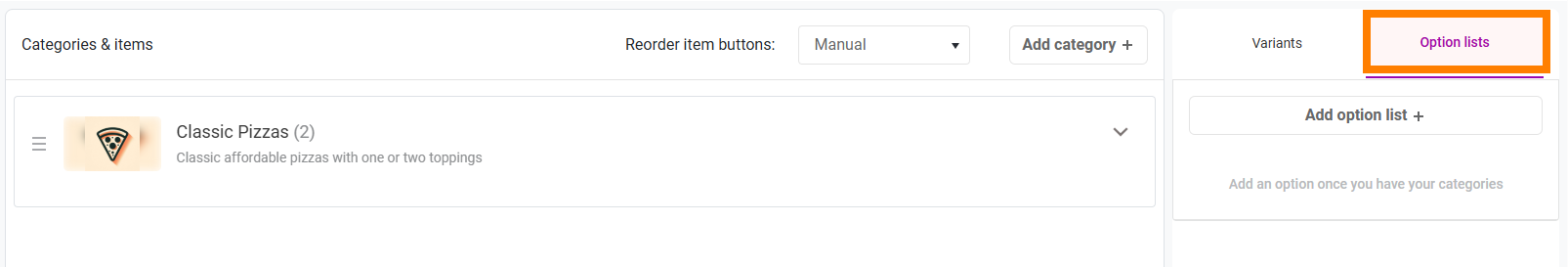 Note that the menu items you wish to add to option lists will need to have already been created. For this example, we want to add "Extra Mozzarella" and "Extra Cheddar", so we've already created those items in the main item list, in a category called "Extras".