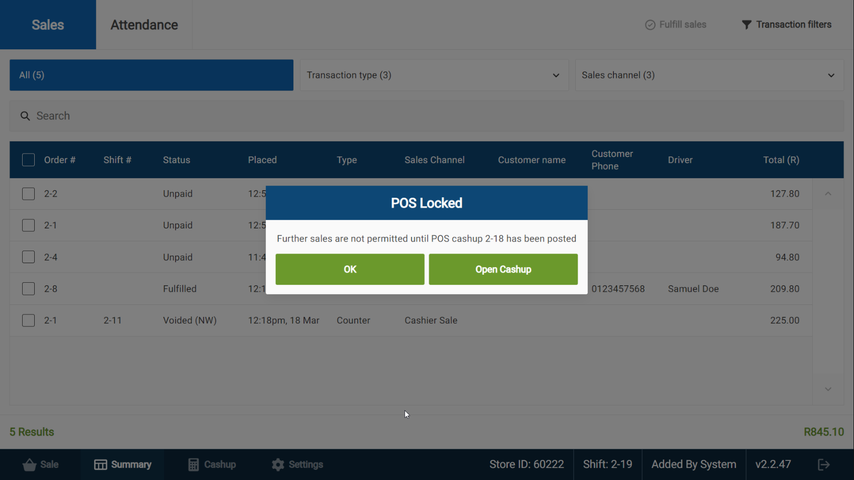 Note that you may be prevented from starting a shift if there are outstanding cashups that need to be attended to. Post these cashups first before starting a shift.