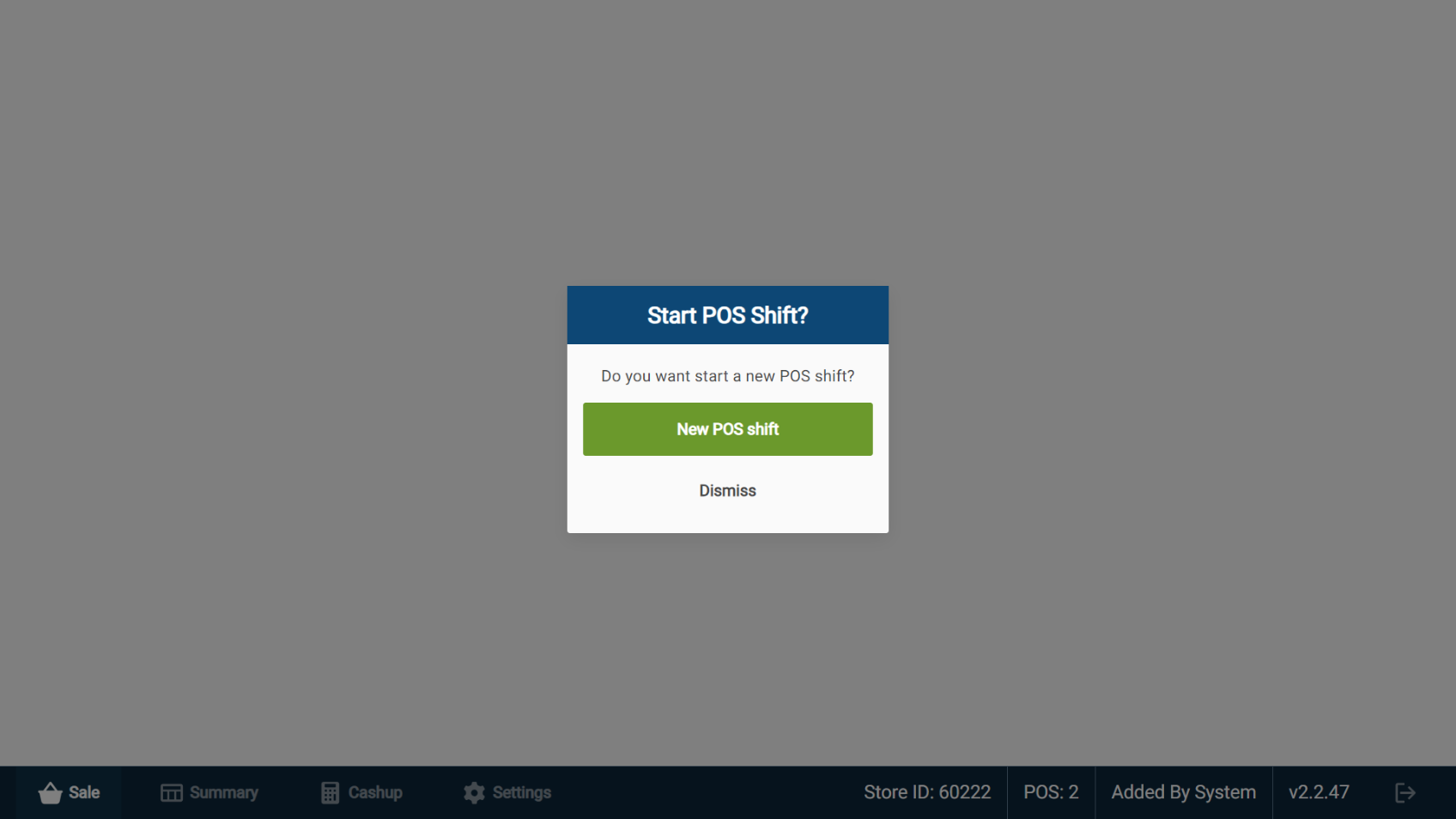 Now that you are logged in you will be asked if you want to Start POS Shift. Tap New POS Shift to open a new shift for sales. If you select Dismiss you will not be able to process any sales.