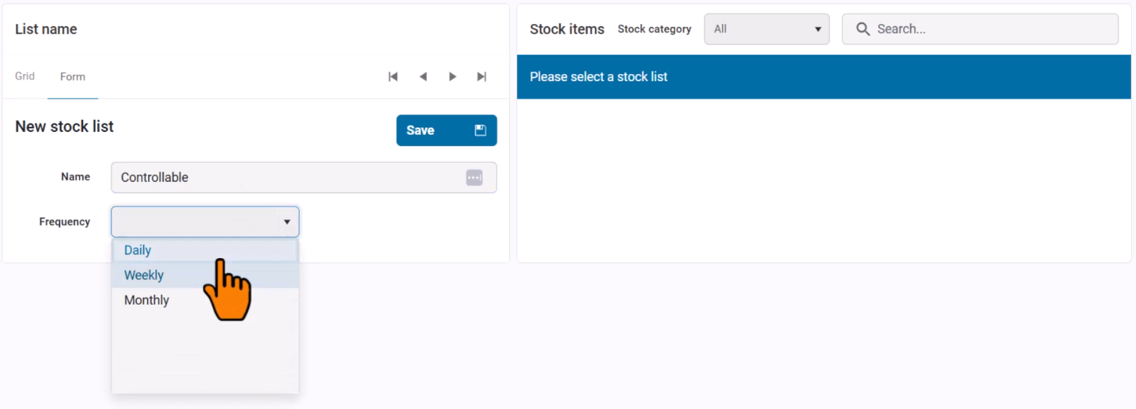- Set the stock check frequency (e.g., Daily for high-risk items like meat and cheese).
