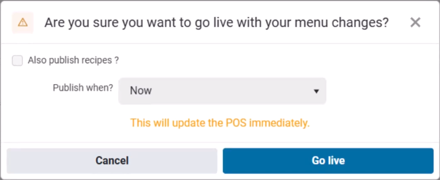 You will have the option to Also publish recipes - set this if you want to include any updates to recipes you may have made in the Named recipes or Menu item recipe pages.