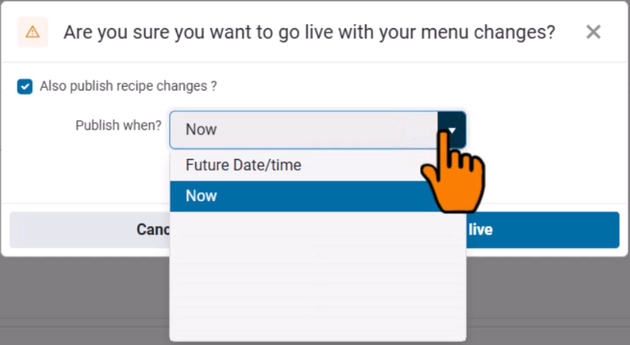 - Selecting Future Date/time lets you specify a publish date for your changes to go live. This is useful if you want to, for example, create a change for a new weekend special. You can make the change earlier in the week, and then schedule the new menu to go live on Saturday morning.