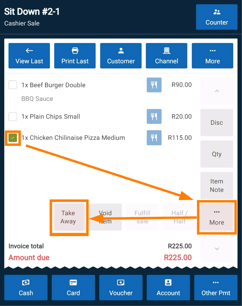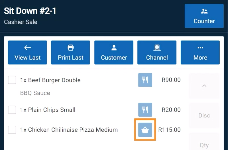 CounterPOS allows you to mark a sale—or individual items—as Take-Away or Sit-Down, affecting stock control and kitchen instructions.