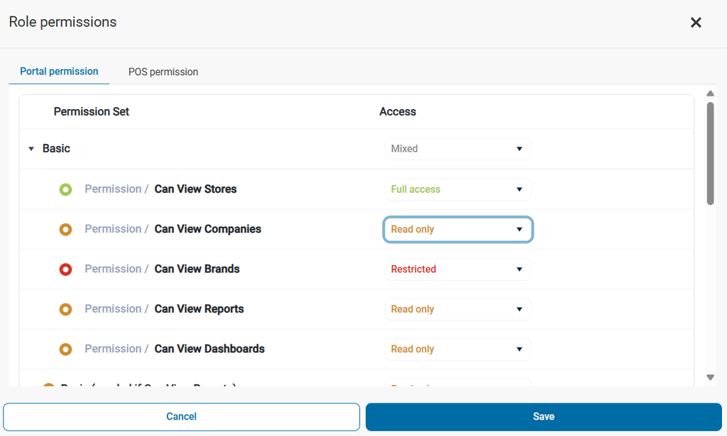 Permissions are grouped in Permission Sets. Access can be granted to the entire set or to each individual permission. Access to Portal permissions has three levels: