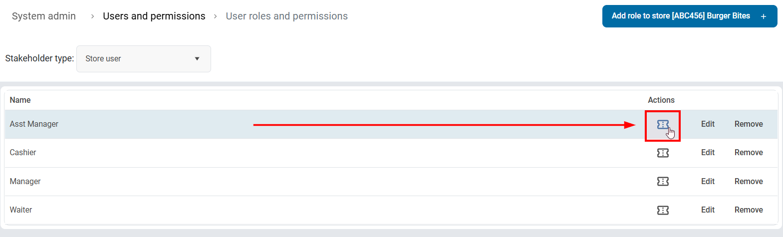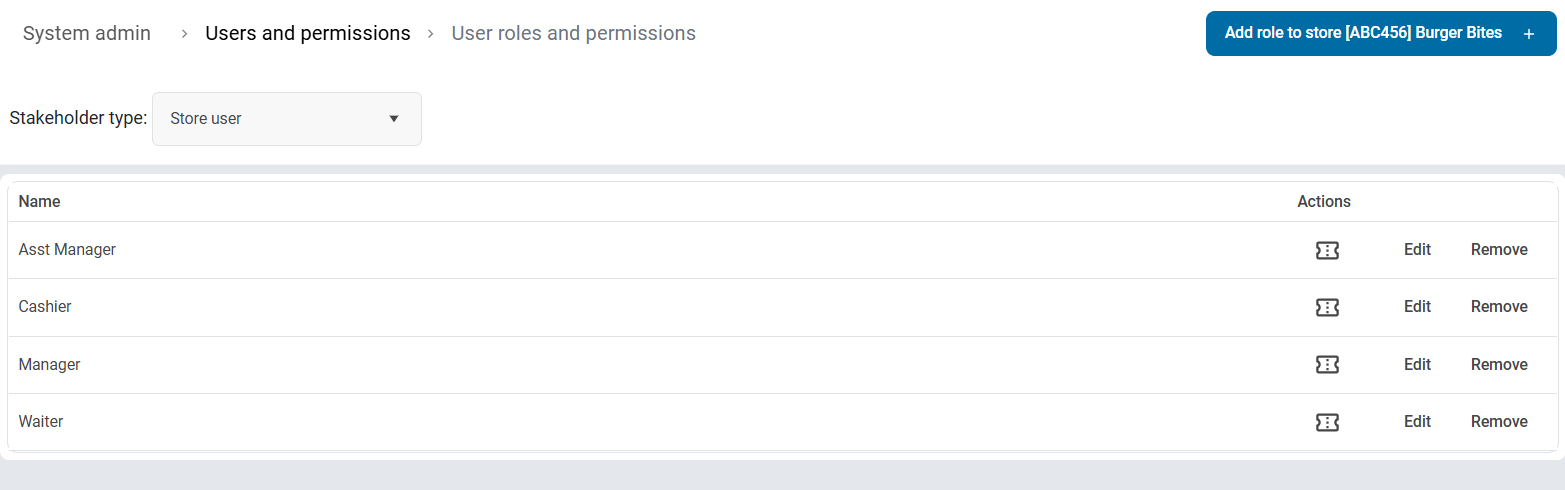 Click Add role to store [(storeID)] (Store Name) to add a role to the currently selected stakeholder type.