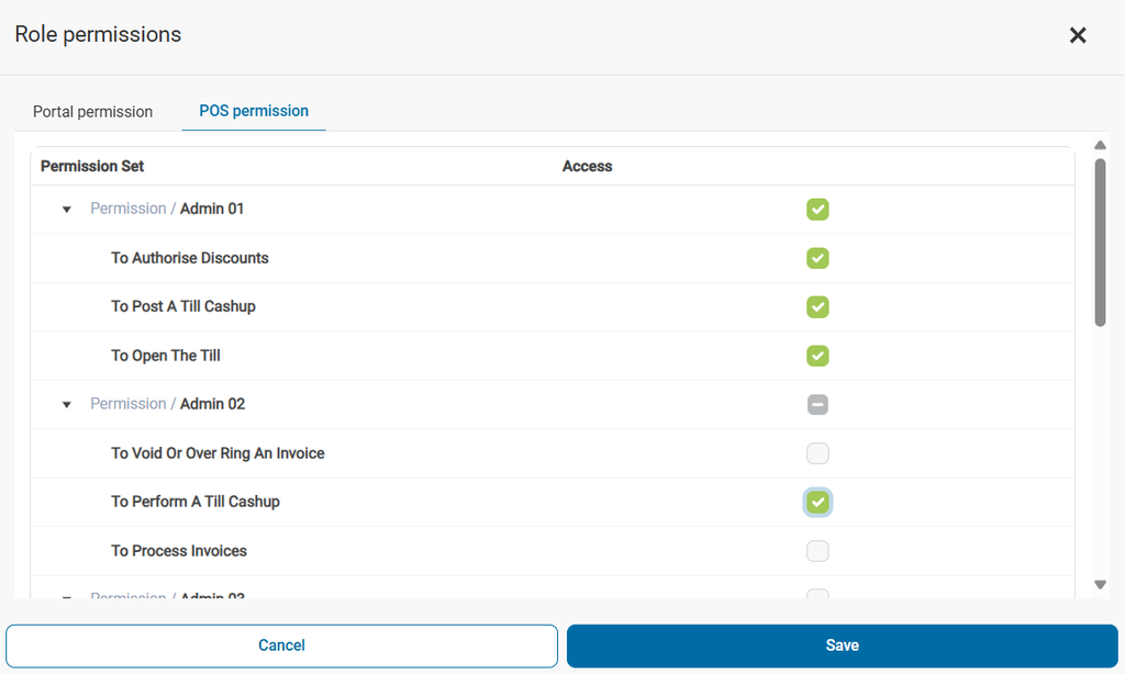 POS permissions are binary in that they are only either allowed or restricted. POS permissions govern what a user can do in POS products such as CounterPOS. Click the checkbox to allow/deny a permission set or individual permissions in each set.