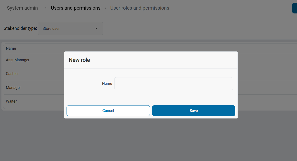 A panel will appear prompting you to input a Name for the role. This should correspond to the users’ role in the store (i.e cashier, manager etc.). Click Save to save the role.
