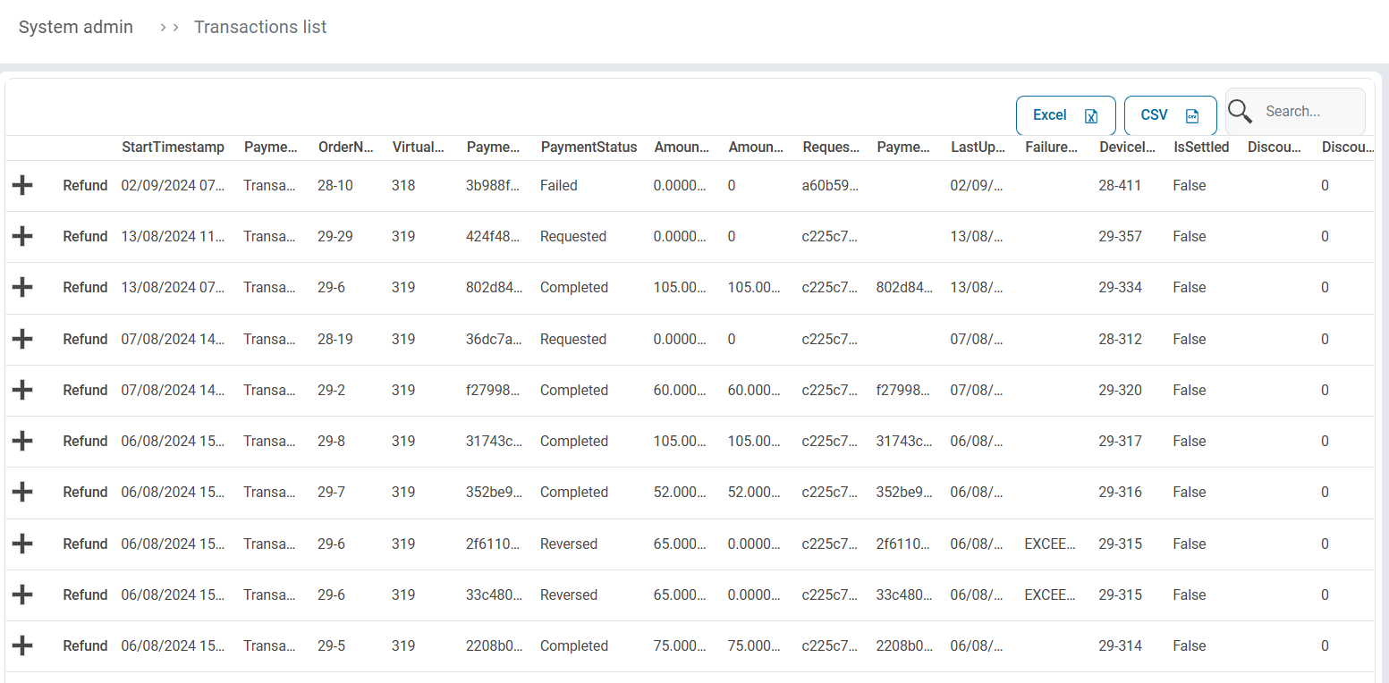 The Transactions List page displays a complete list of all transactions that have been processed by an integrated payment platform.