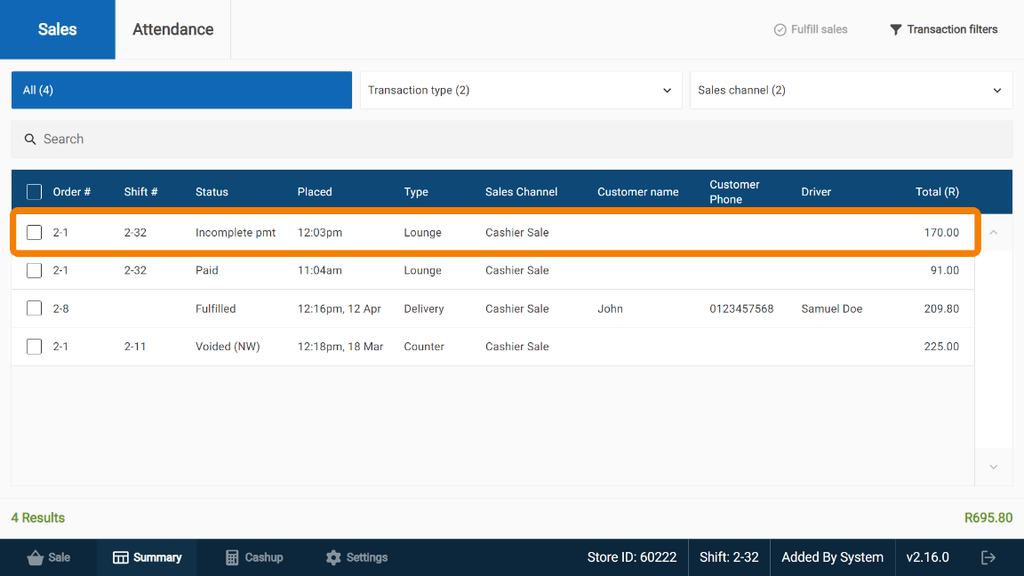 The order will be indicated as a Lounge order with a status of Incomplete Payment.