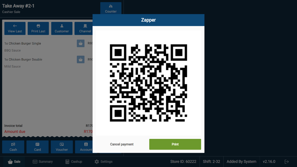 CounterPOS will immediately begin to process the payment, and will generate a QR code on the screen. If you are using a mobile device or tablet, you can present the code on the screen to the customer to scan. If scanned now, the order will complete immediately.