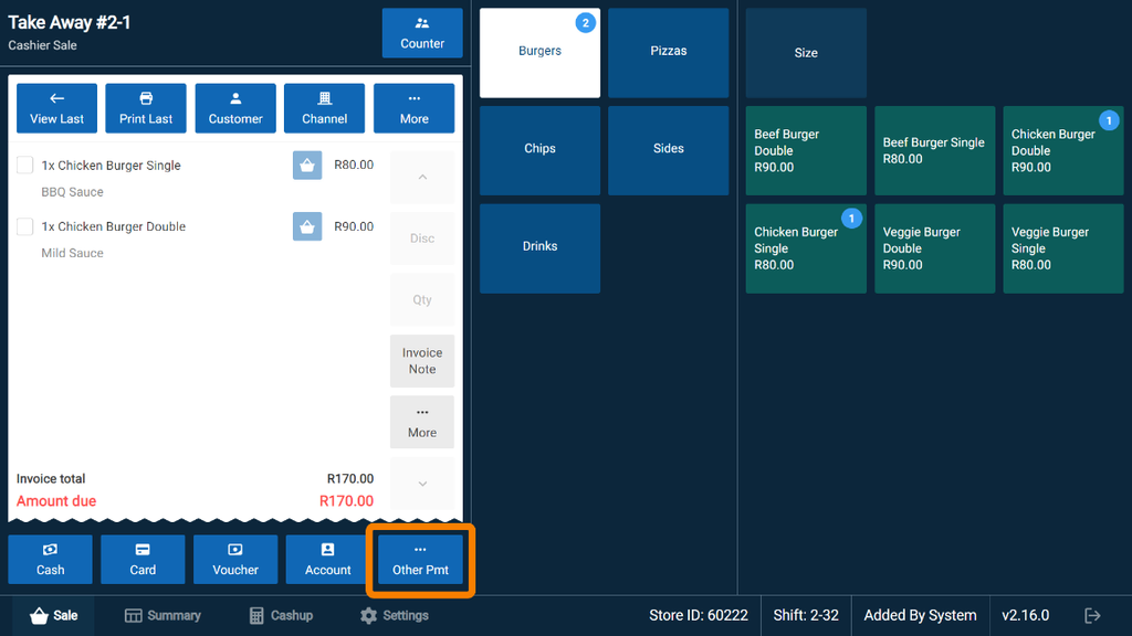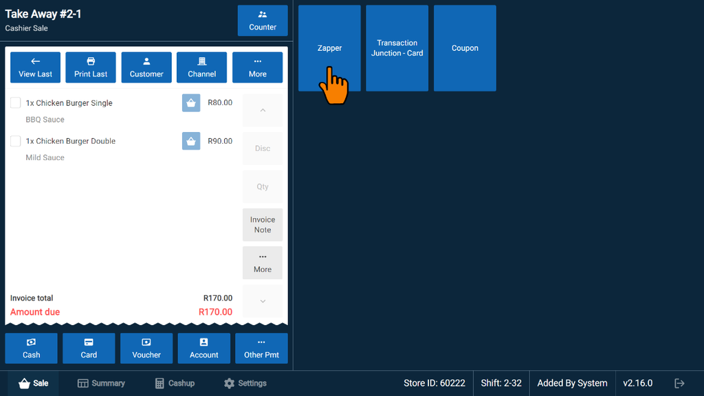 To process a Zapper payment, once the items have been rung up and the customer is ready to pay, tap the Other Pmt button.
